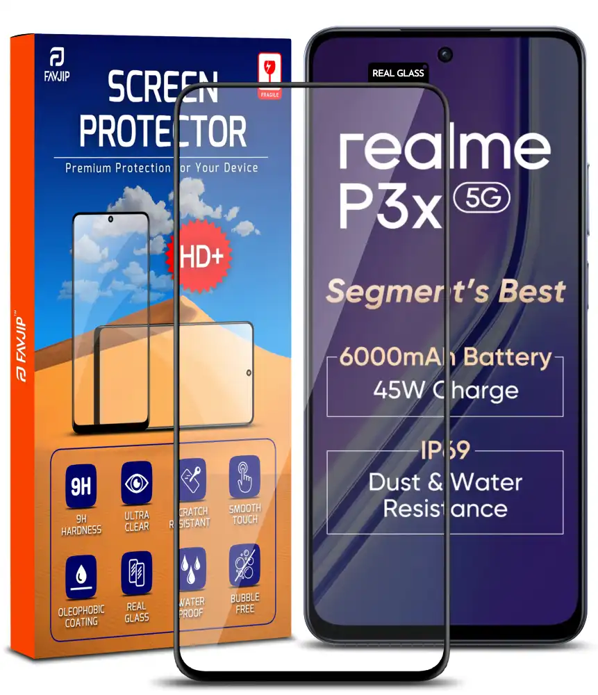 FAVJIP Edge to Edge Tempered Glass Screen Guard Protector for Realme P3x 5G with Easy Installation Kit – Pack of 1