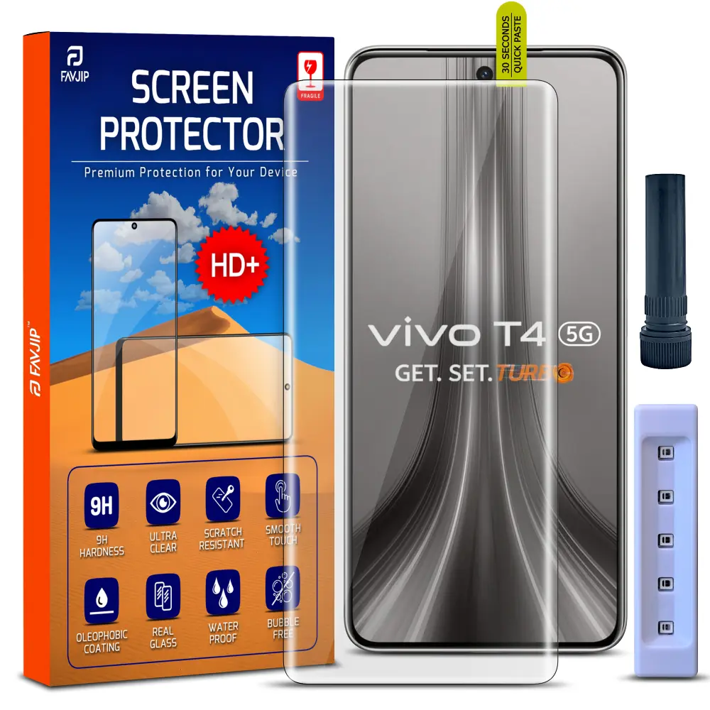 FAVJIP Edge to Edge UV Liquid Glue Quad Curved Tempered Glass Screen Guard Protector for Vivo T4 5G with Easy Installation Kit – Pack of 1