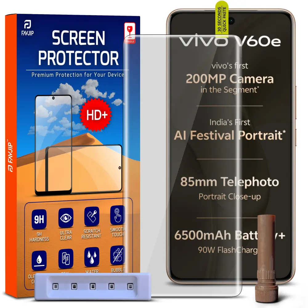 FAVJIP Edge to Edge UV Liquid Glue Quad Curved Tempered Glass Screen Guard Protector for Vivo V60e 5G with Easy Installation Kit – Pack of 1